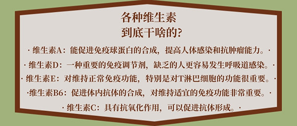 維生素A能促進(jìn)免疫球蛋白的合成,提高人體感染和抗腫瘤能力;維生素A還能消除免疫耐受。影響免疫反應(yīng)的各種細(xì)胞因子也可能在維生素A缺乏時(shí)發(fā)生改變,從而影響體內(nèi)抗原-抗體反應(yīng)。