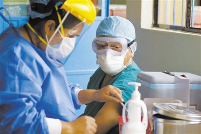 在秘魯首都利馬圣巴托洛梅國立醫(yī)院,一線醫(yī)護(hù)人員接種新冠疫苗(資料照片)。新華社發(fā)(瑪利亞娜·巴索攝)