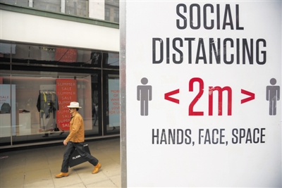 圖為在英國倫敦,一名男子從提示人們保持社交距離的牌子旁走過。