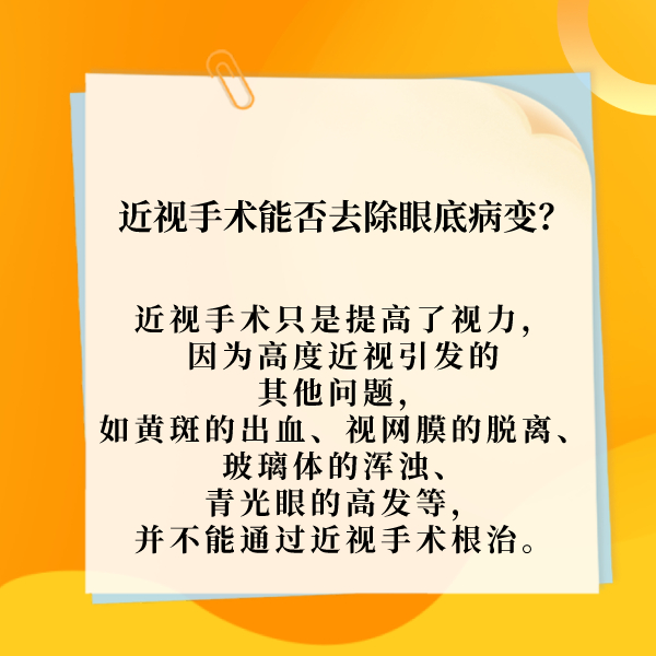 “需要注意的是,近視眼手術只是提高了視力,并不能去除部分由高度近視眼引發的眼底病變。”翟長斌說,如果把眼睛比作照相機,近視眼患者的照相機主要存在的問題是焦距不對,通過調整鏡頭后可以正常使用。但如果照相機的底片已經出現了因為高度近視引發的其他問題,如黃斑的出血、視網膜的脫離、玻璃體的渾濁、青光眼的高發等,并不能通過近視眼手術根治。