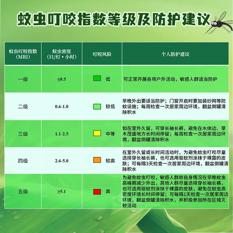 當預測的蚊蟲叮咬指數級別為“三級”的時候,其叮咬風險等級為“中等”;市民如在室外久留,可穿長袖長褲,避免在水體邊、草木茂盛地方長時間停留,每周檢查一次居家周邊環境,翻盆倒罐清除積水。