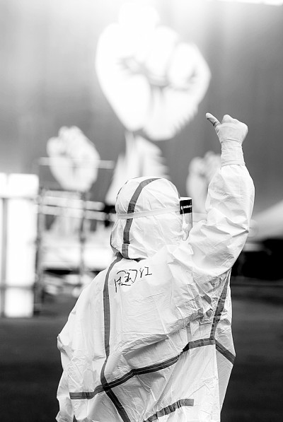 一名醫務人員在武漢體育中心方艙醫院前豎起拇指為自己和同伴加油鼓勁(2020年2月12日攝)。 新華社發
