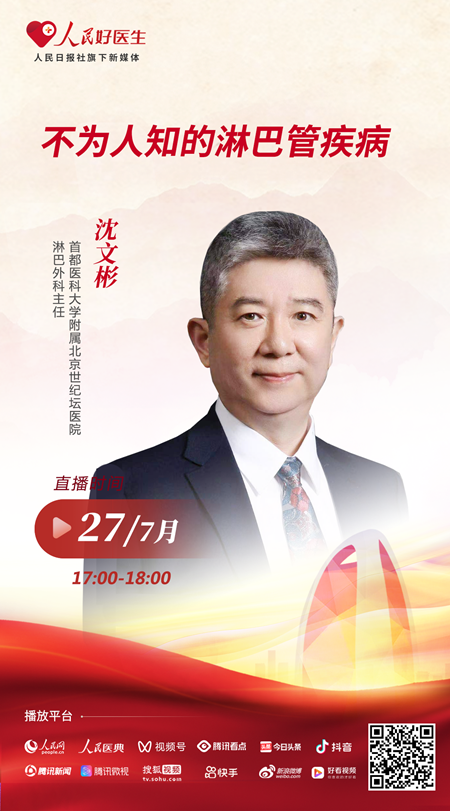 7月27日17:00-18:00,“人民好醫生”客戶端將邀請首都醫科大學附屬北京世紀壇醫院淋巴外科主任沈文彬進行視頻直播,給大家科普淋巴管疾病診療的相關知識,千萬不要錯過。