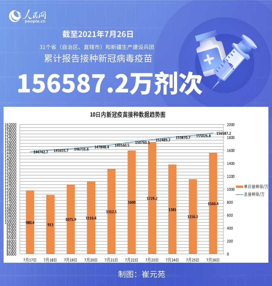 人民網(wǎng)北京7月27日電 (記者崔元苑)據(jù)國(guó)家衛(wèi)生健康委官網(wǎng)消息,截至2021年7月26日,31個(gè)省(自治區(qū)、直轄市)和新疆生產(chǎn)建設(shè)兵團(tuán)累計(jì)報(bào)告接種新冠病毒疫苗156587.2萬(wàn)劑次。