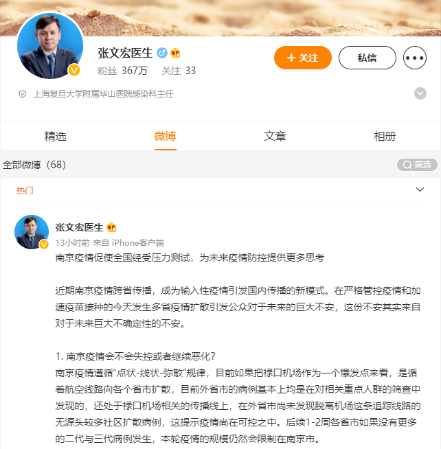 人民網北京7月29日電 (記者崔元苑)近期,南京新冠肺炎疫情跨省傳播引發高度關注。7月29日凌晨,復旦大學附屬華山醫院感染科主任張文宏發微博表示,南京疫情促使全國經受壓力測試,同時也為未來疫情防控提供更多思考。針對公眾關心的問題,張文宏進行了分析和解讀。