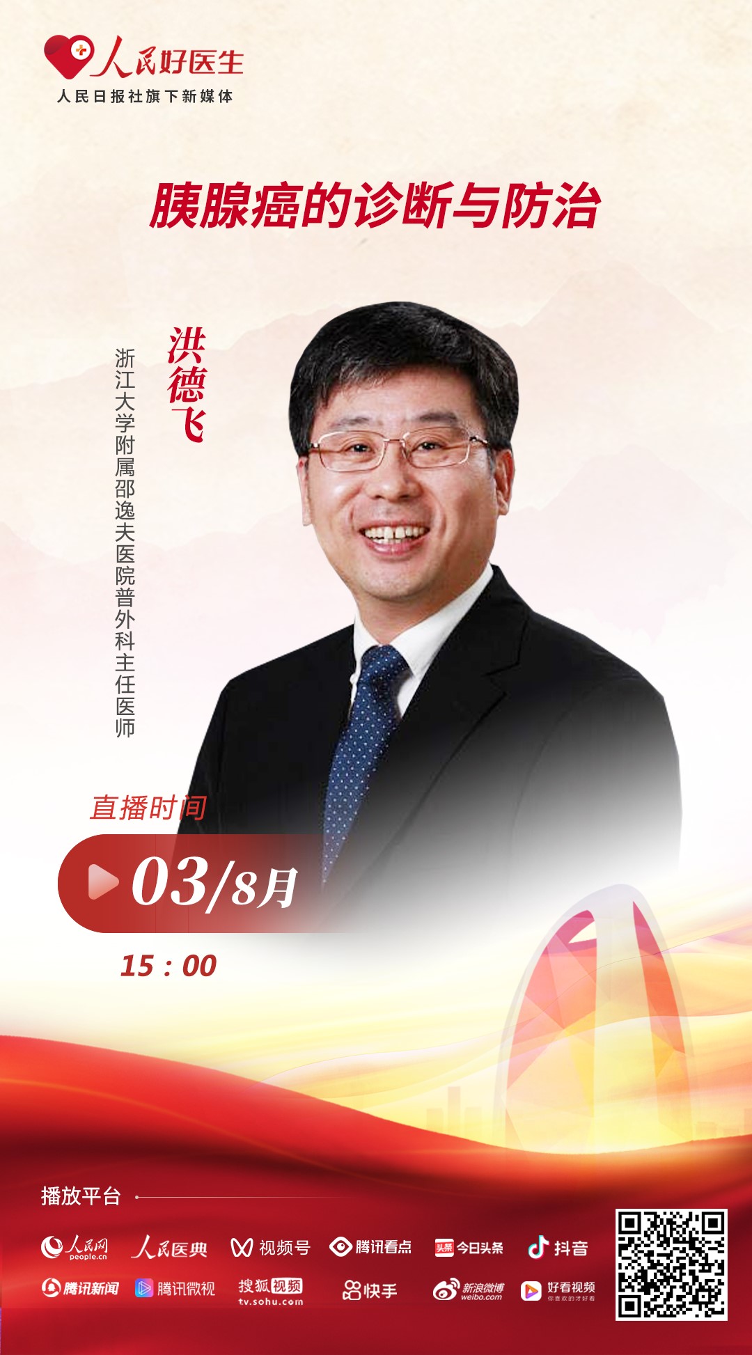 8月3日15:00,浙江大學(xué)附屬邵逸夫醫(yī)院普外科主任醫(yī)師洪德飛將做客人民日?qǐng)?bào)社旗下新媒體“人民好醫(yī)生”客戶(hù)端,就“胰腺癌的診斷與防治”為大眾答疑解惑。
