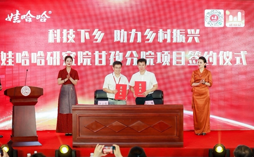 同時,為助力鄉村振興,幫助四川甘孜州天然農特產品走出大山,娃哈哈在研發和營銷端同時發力,與甘孜政府共創科技下鄉合作新模式,并在發布會現場舉行了“娃哈哈快銷網甘孜項目簽約儀式”和“娃哈哈研究院甘孜分院項目簽約儀式”。