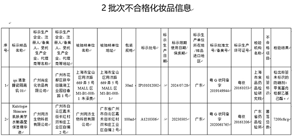 人民網北京8月2日電 (記者孫紅麗)據國家藥監局官網消息,國家藥監局近日發布通告稱, 在2021年國家化妝品監督抽檢工作中,經上海市食品藥品檢驗研究院等單位檢驗,標示為廣州尚莊化妝品有限公司生產的ipi清澈搪瓷隔離乳01,廣州同濟生物科技有限公司生產的Kalologie Skincare肌膚美學水嫩晶瑩保濕精華液不合格。