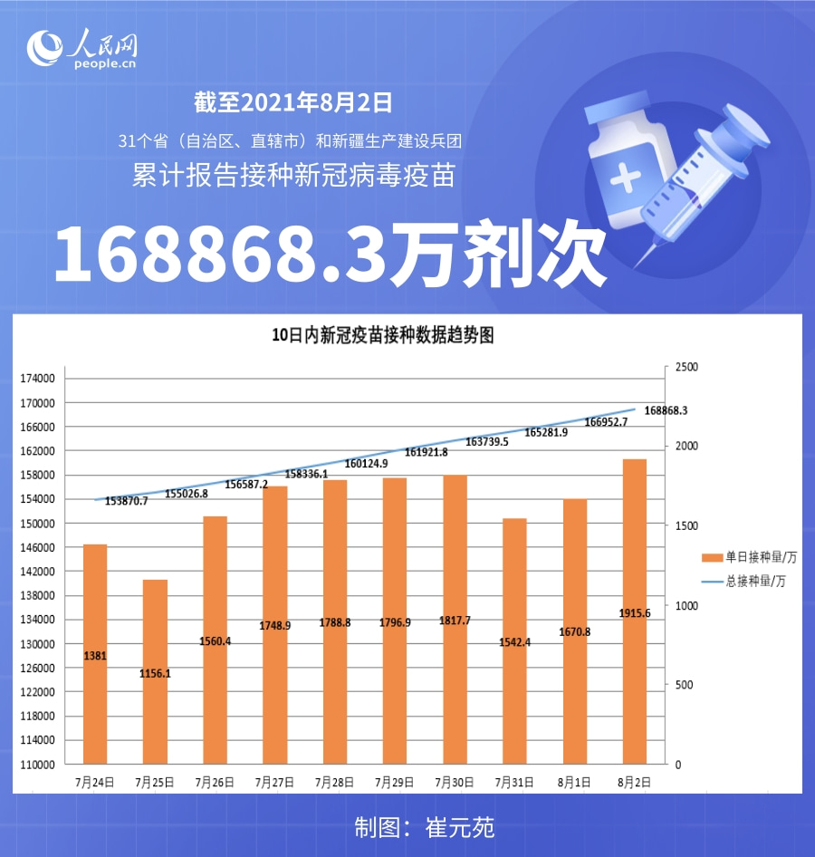 人民網北京8月3日電 (記者崔元苑)據國家衛生健康委官網消息,截至2021年8月2日,31個省(自治區、直轄市)和新疆生產建設兵團累計報告接種新冠病毒疫苗168868.3萬劑次。