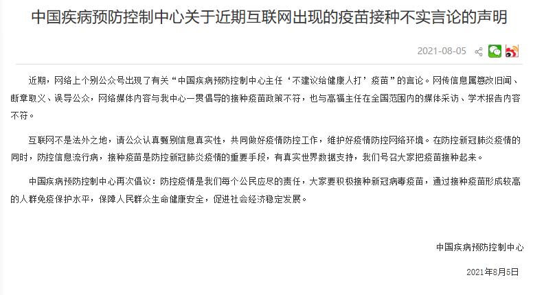 中疾控:近期互聯網出現的“不建議給健康人打疫苗”言論不實