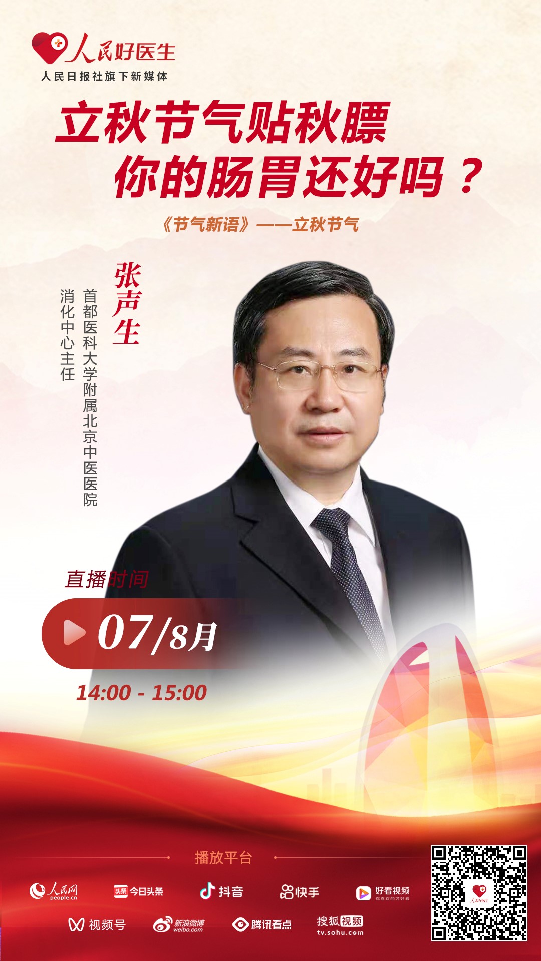 8月7日14:00,我們將邀請到首都醫科大學附屬北京中醫醫院消化中心主任張聲生做客演播室,為大家講解立秋節氣養生知識。