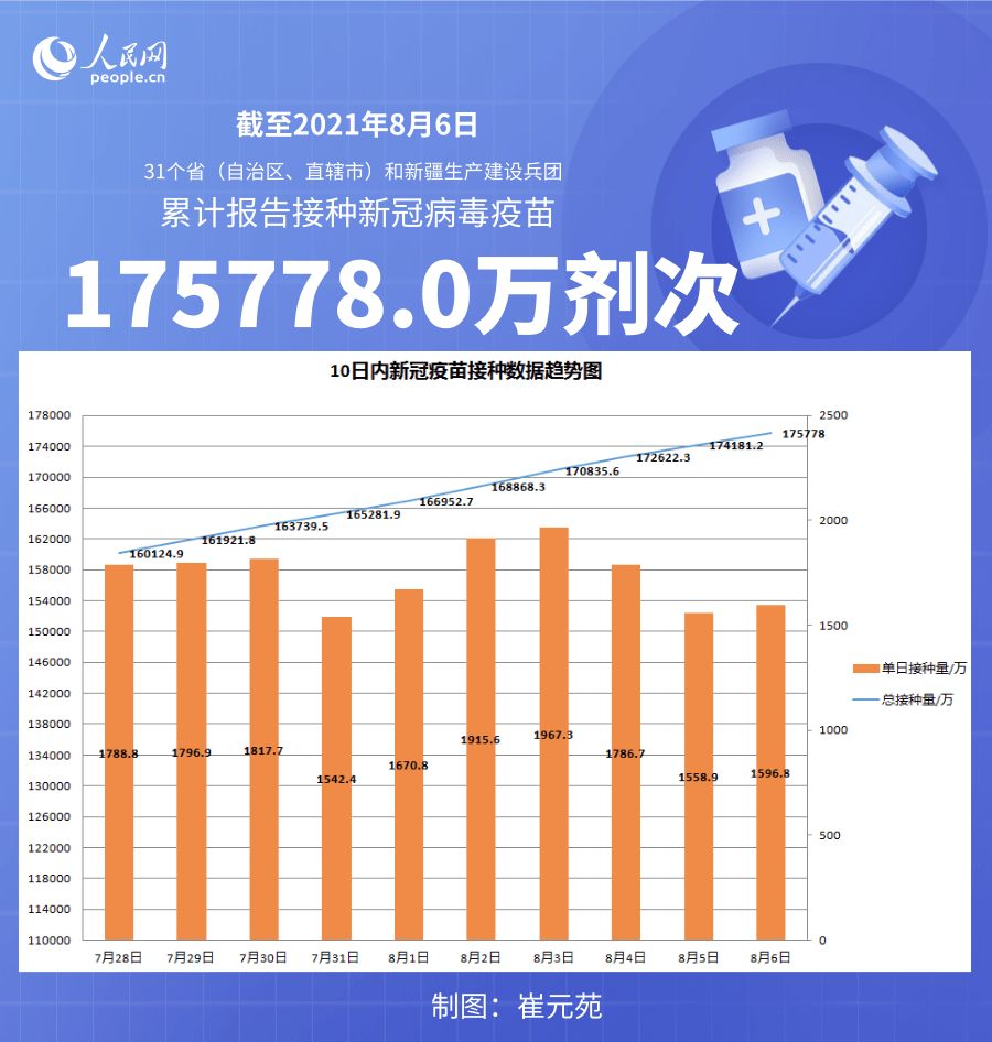 人民網(wǎng)北京8月7日電 (記者崔元苑)據(jù)國家衛(wèi)生健康委官網(wǎng)消息,截至2021年8月6日,31個。ㄗ灾螀^(qū)、直轄市)和新疆生產(chǎn)建設兵團累計報告接種新冠病毒疫苗175778.0萬劑次。