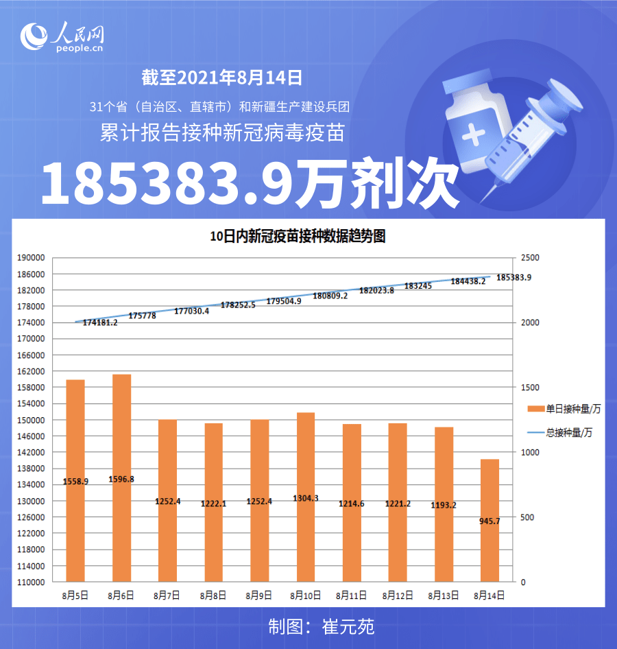 人民網(wǎng)北京8月15日電 (記者崔元苑)據(jù)國(guó)家衛(wèi)生健康委官網(wǎng)消息,截至2021年8月14日,31個(gè)省(自治區(qū)、直轄市)和新疆生產(chǎn)建設(shè)兵團(tuán)累計(jì)報(bào)告接種新冠病毒疫苗185383.9萬(wàn)劑次。