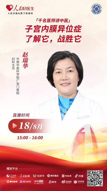8月18日15:00,人民日?qǐng)?bào)社旗下新媒體平臺(tái)“人民好醫(yī)生”與國(guó)家中醫(yī)藥管理局辦公室聯(lián)合推出的“千名醫(yī)師講中醫(yī)”系列直播將邀請(qǐng)到中國(guó)中醫(yī)科學(xué)院廣安門醫(yī)院婦科主任趙瑞華做客直播間,為大眾詳細(xì)科普子宮內(nèi)膜異位癥的防治,千萬(wàn)不要錯(cuò)過(guò)。