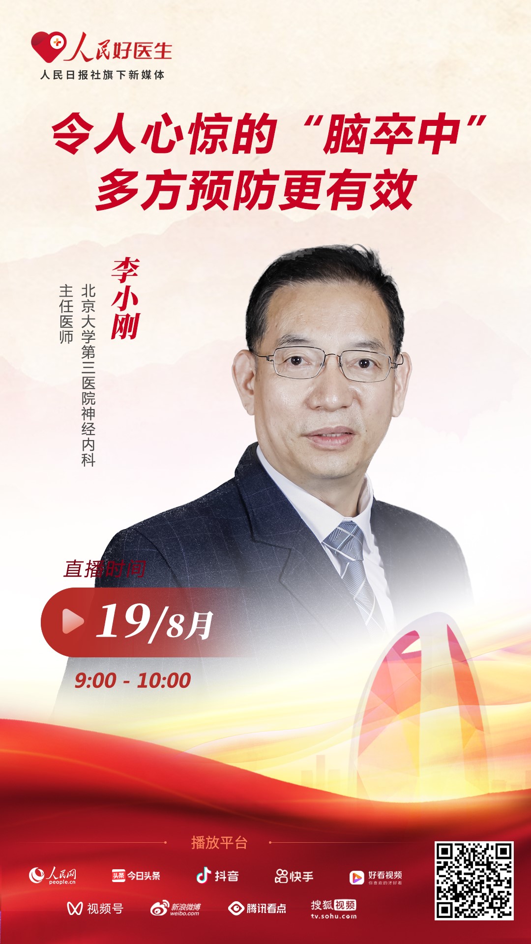 8月19日9:00-10:00,“人民好醫生”客戶端將邀請北京大學第三醫院神經內科主任醫師李小剛,就心血管健康的相關內容進行科普直播,歡迎大家收看!