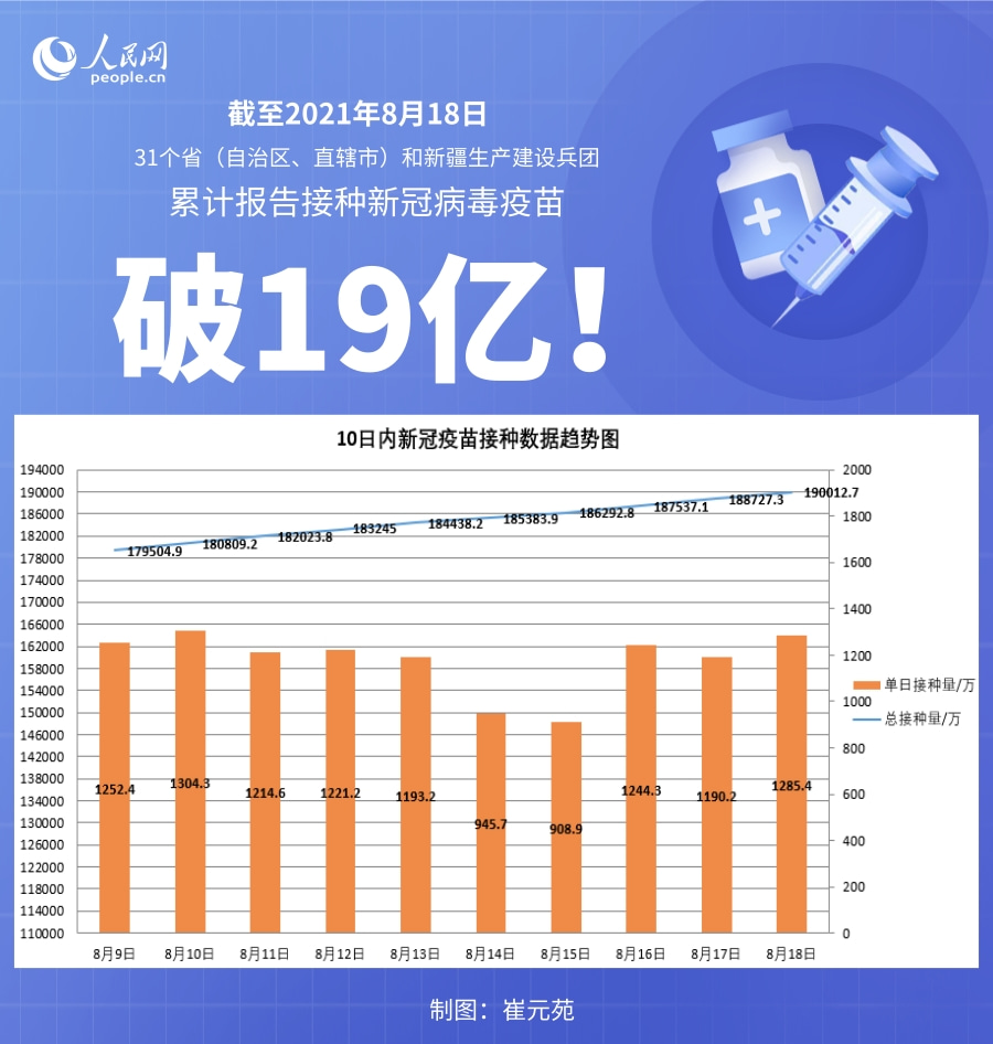 人民網北京8月19日電 (記者崔元苑)據國家衛生健康委官網消息,截至2021年8月18日,31個省(自治區、直轄市)和新疆生產建設兵團累計報告接種新冠病毒疫苗190012.7萬劑次。
