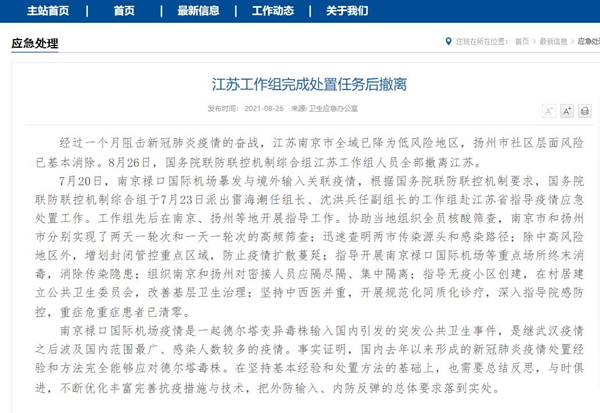 人民網北京8月26日電 (記者張文婷)據國家衛健委官網消息,經過一個月阻擊新冠肺炎疫情的奮戰,江蘇南京市全域已降為低風險地區,揚州市社區層面風險已基本消除。8月26日,國務院聯防聯控機制綜合組江蘇工作組人員全部撤離江蘇。