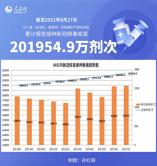 人民網(wǎng)北京8月28日電 (記者孫紅麗)據(jù)國(guó)家衛(wèi)生健康委官網(wǎng)消息,截至2021年8月27日,31個(gè)。ㄗ灾螀^(qū)、直轄市)和新疆生產(chǎn)建設(shè)兵團(tuán)累計(jì)報(bào)告接種新冠病毒疫苗201954.9萬(wàn)劑次。