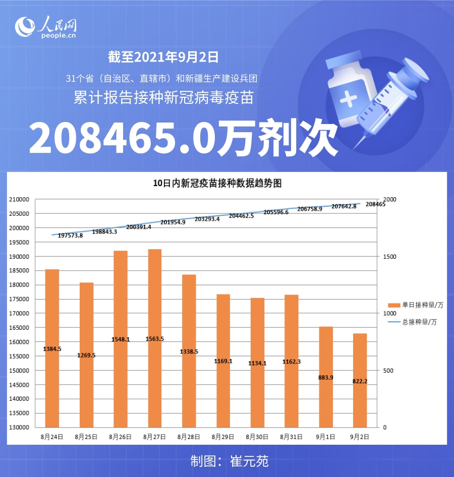 人民網北京9月3日電 (記者崔元苑)據國家衛生健康委官網消息,截至2021年9月2日,31個省(自治區、直轄市)和新疆生產建設兵團累計報告接種新冠病毒疫苗208465.0萬劑次。
