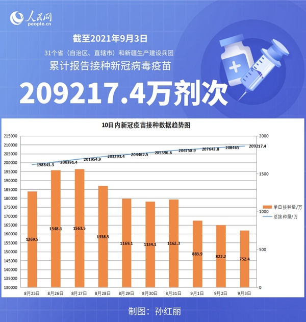 人民網(wǎng)北京9月4日電 (記者孫紅麗)據(jù)國家衛(wèi)生健康委官網(wǎng)消息,截至2021年9月3日,31個省(自治區(qū)、直轄市)和新疆生產(chǎn)建設(shè)兵團(tuán)累計(jì)報(bào)告接種新冠病毒疫苗209217.4萬劑次。
