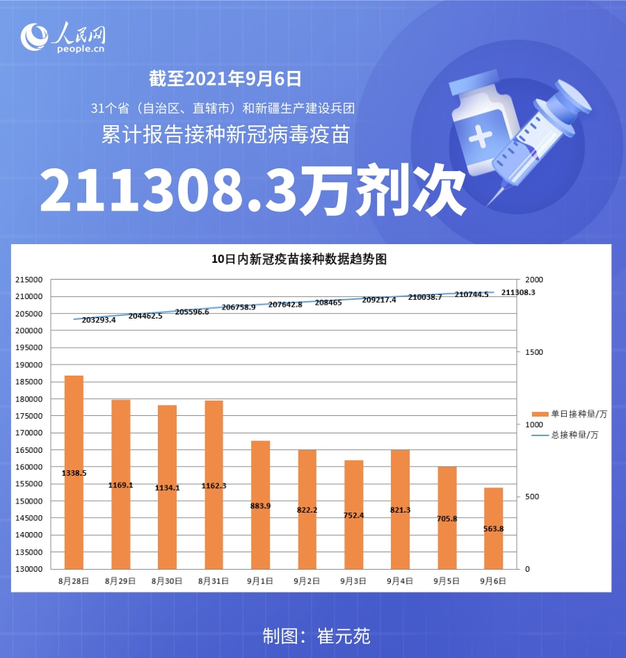 人民網北京9月7日電 (記者崔元苑)據國家衛生健康委官網消息,截至2021年9月6日,31個省(自治區、直轄市)和新疆生產建設兵團累計報告接種新冠病毒疫苗211308.3萬劑次。