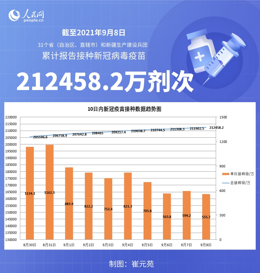 人民網(wǎng)北京9月9日電 (記者崔元苑)據(jù)國家衛(wèi)生健康委官網(wǎng)消息,截至2021年9月8日,31個(gè)省(自治區(qū)、直轄市)和新疆生產(chǎn)建設(shè)兵團(tuán)累計(jì)報(bào)告接種新冠病毒疫苗212458.2萬劑次。