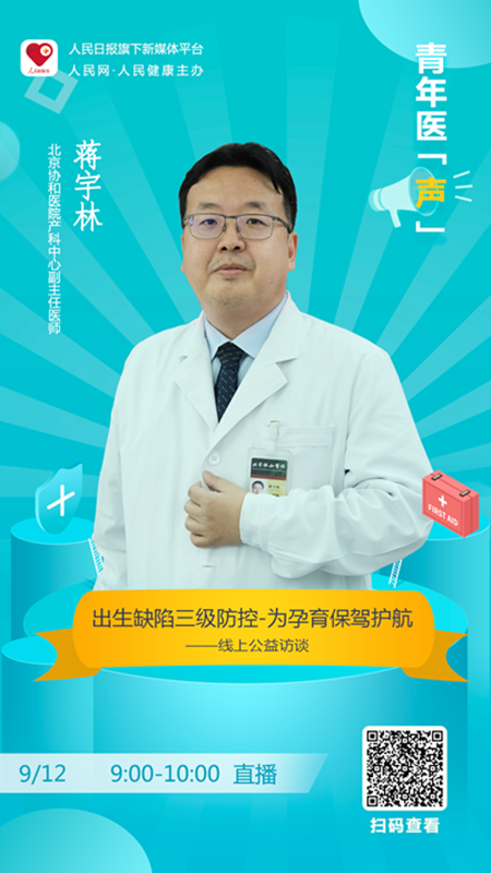 9月12日9:00-10:00,“人民好醫(yī)生”客戶端將邀請北京協(xié)和醫(yī)院產(chǎn)科中心副主任醫(yī)師蔣宇林做客“青年醫(yī)‘聲’”欄目,為大家詳細(xì)講解出生缺陷三級防控的相關(guān)知識,千萬不要錯過。
