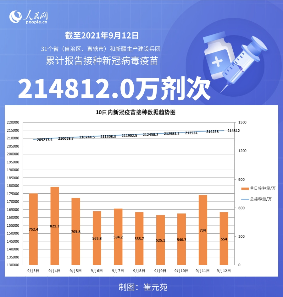 人民網(wǎng)北京9月13日電 (記者崔元苑)據(jù)國(guó)家衛(wèi)生健康委官網(wǎng)消息,截至2021年9月12日,31個(gè)省(自治區(qū)、直轄市)和新疆生產(chǎn)建設(shè)兵團(tuán)累計(jì)報(bào)告接種新冠病毒疫苗214812.0萬(wàn)劑次。