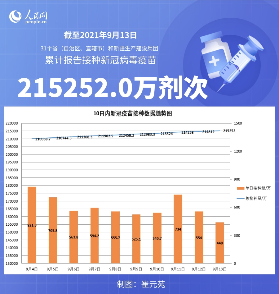 人民網北京9月14日電 (記者崔元苑)據國家衛生健康委官網消息,截至2021年9月13日,31個省(自治區、直轄市)和新疆生產建設兵團累計報告接種新冠病毒疫苗215252.0萬劑次。