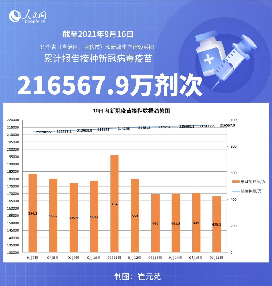人民網北京9月17日電 (記者崔元苑)據國家衛生健康委官網消息,截至2021年9月16日,31個。ㄗ灾螀^、直轄市)和新疆生產建設兵團累計報告接種新冠病毒疫苗216567.9萬劑次。
