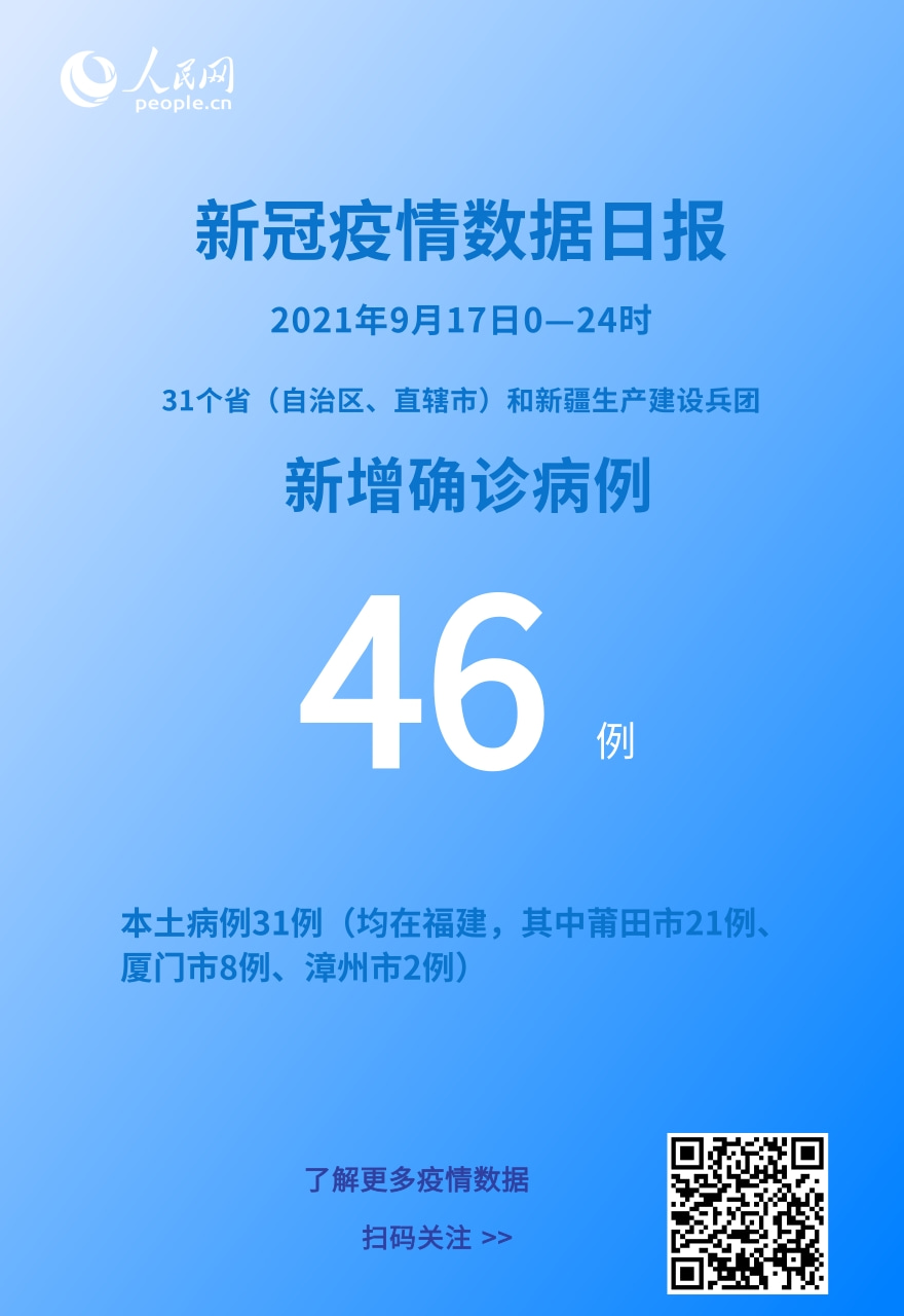 人民網北京9月18日電 (記者崔元苑)今日,國家衛生健康委于官網發布了截至9月17日24時新型冠狀病毒肺炎疫情最新情況。9月17日0—24時,31個省(自治區、直轄市)和新疆生產建設兵團報告新增確診病例46例。其中境外輸入病例15例(云南9例,廣東3例,上海2例,遼寧1例),含2例由無癥狀感染者轉為確診病例(均在廣東);本土病例31例(均在福建,其中莆田市21例、廈門市8例、漳州市2例),含6例由無癥狀感染者轉為確診病例(均在福建)。無新增死亡病例。無新增疑似病例。