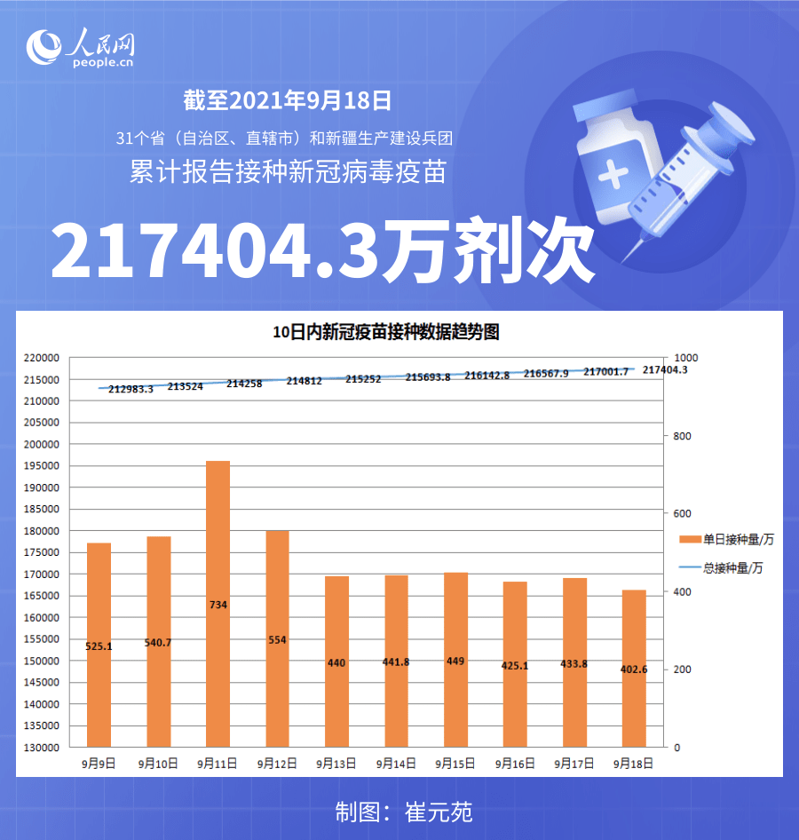人民網北京9月19日電 (記者崔元苑)據國家衛生健康委官網消息,截至2021年9月18日,31個省(自治區、直轄市)和新疆生產建設兵團累計報告接種新冠病毒疫苗217404.3萬劑次。