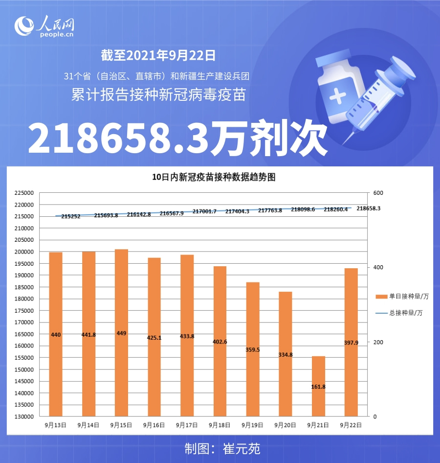 人民網(wǎng)北京9月23日電 (記者崔元苑)據(jù)國家衛(wèi)生健康委官網(wǎng)消息,截至2021年9月22日,31個。ㄗ灾螀^(qū)、直轄市)和新疆生產(chǎn)建設(shè)兵團(tuán)累計報告接種新冠病毒疫苗218658.3萬劑次。