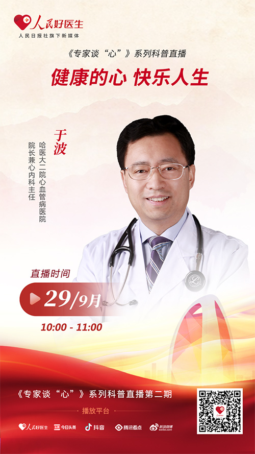 心血管疾病是一種常見的慢性非傳染性疾病。心血管疾病的患病人群逐漸趨于年輕化。哪些行為或因素會導致疾病的發生?老年人和年輕人在疾病的預防方面存在什么區別?9月29日10:00-11:00,哈爾濱醫科大學附屬第二醫院心血管病醫院院長兼心內科主任于波將做客“人民好醫生”APP直播間,為大眾科普心血管疾病的預防知識。歡迎屆時收看。