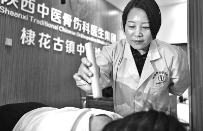陜西省商洛市棣花古鎮中醫診所艾灸師何丹玲在為患者調理頸椎。新華社發