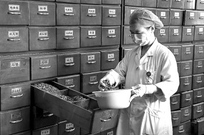 鄭州市中醫院的藥師在煎藥中心內配藥。新華社發