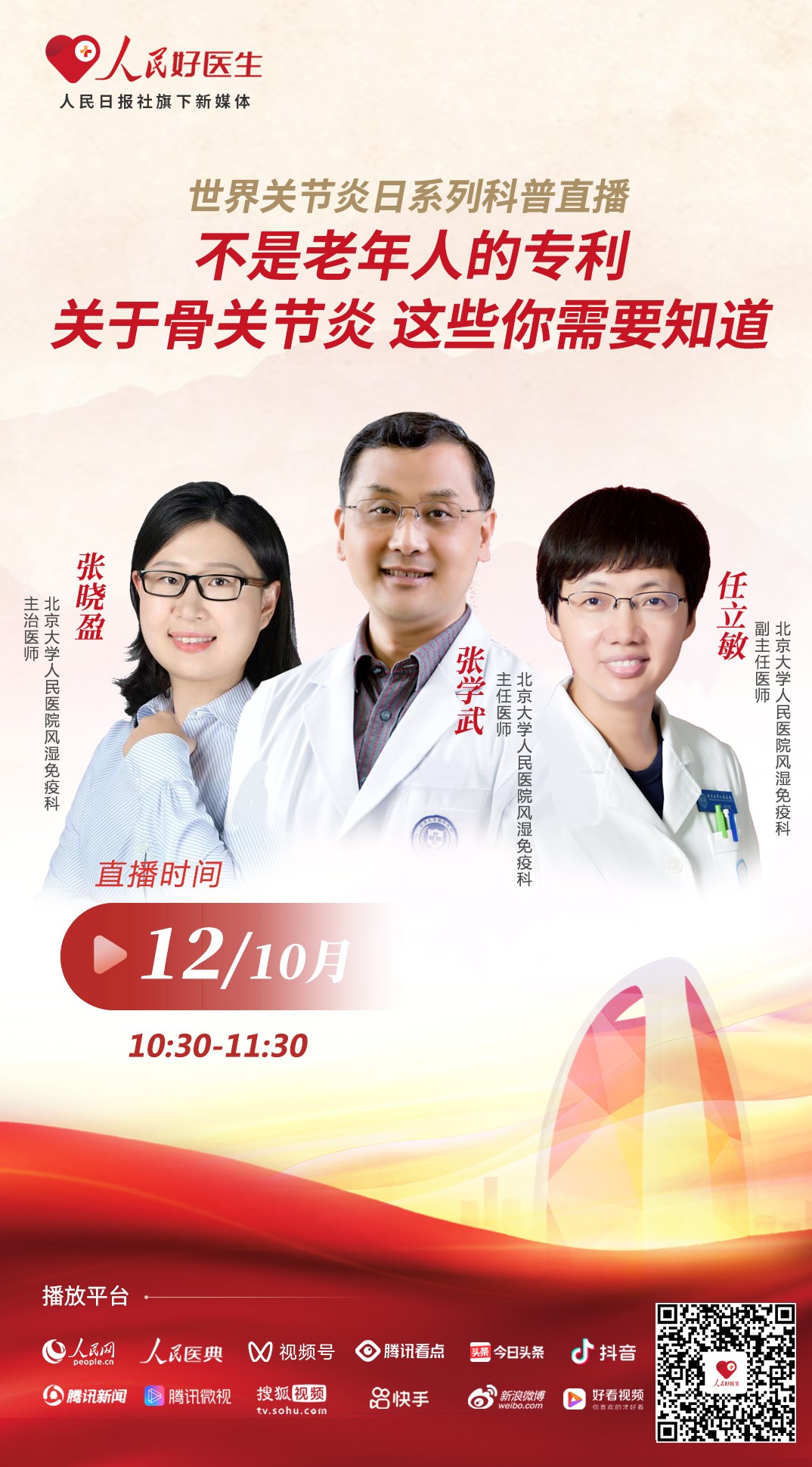 10月12日10:30-11:30,人民日報社旗下新媒體平臺“人民好醫生”將邀請北京大學人民醫院風濕免疫科主任醫師張學武、北京大學人民醫院風濕免疫科副主任醫師任立敏、北京大學人民醫院風濕免疫科主治醫師張曉盈做客直播間,為大家詳細科普骨關節炎的診療,千萬不要錯過。