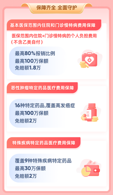 基本醫(yī)保范圍內(nèi)住院、門(mén)診慢特病費(fèi)用最高保障100萬(wàn)元;