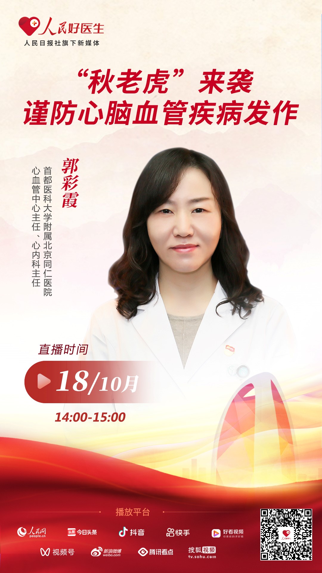 “秋老虎”是指立秋后短時(shí)間的天氣回?zé)岈F(xiàn)象,氣溫波動(dòng)較大,心血管疾病患者病情容易出現(xiàn)反復(fù)、甚至加重。10月18日14:00-15:00,人民日報(bào)社旗下新媒體平臺(tái)“人民好醫(yī)生”將邀請首都醫(yī)科大學(xué)附屬北京同仁醫(yī)院心血管中心主任、心內(nèi)科主任,主任醫(yī)師郭彩霞做客直播間,與大家分享心腦血管方面疾病及相關(guān)預(yù)防、治療科普知識(shí)。