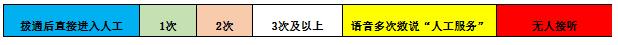 2.轉接人工客服操作步驟分為:撥通后直接進入人工、需操作一次、兩次、三次及以上次數接通人工服務。數據表中根據人工客服撥通的操作次數分成不同顏色區域,如下: