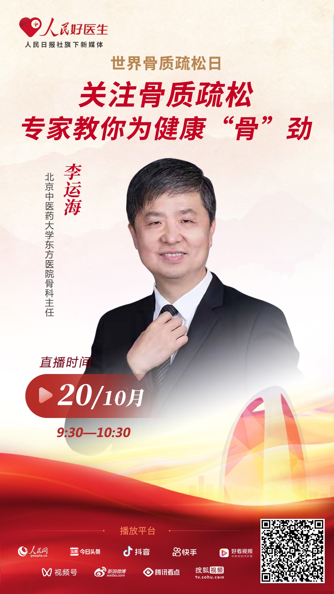 10月20日9:30,北京中醫藥大學東方醫院骨科主任李運海將做客人民好醫生客戶端,和大家分享有關骨質疏松防治相關知識。