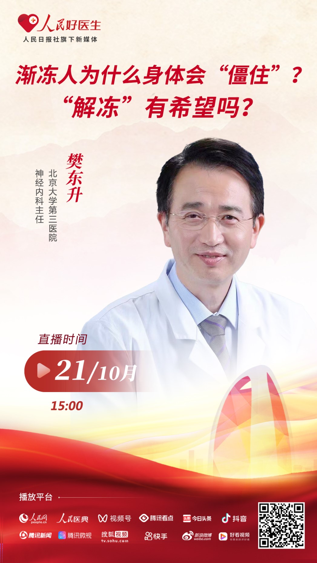 漸凍癥的病因是什么?為什么身體會“僵住”?哪些人群最高危?10月21日15:00,北京大學(xué)第三醫(yī)院神經(jīng)內(nèi)科主任樊東升將做客人民日報社旗下新媒體“人民好醫(yī)生”客戶端,與我們聊聊漸凍癥的話題,讓我們一起來關(guān)注罕見病,關(guān)注“漸凍人”群體,幫助他們提高生活質(zhì)量。