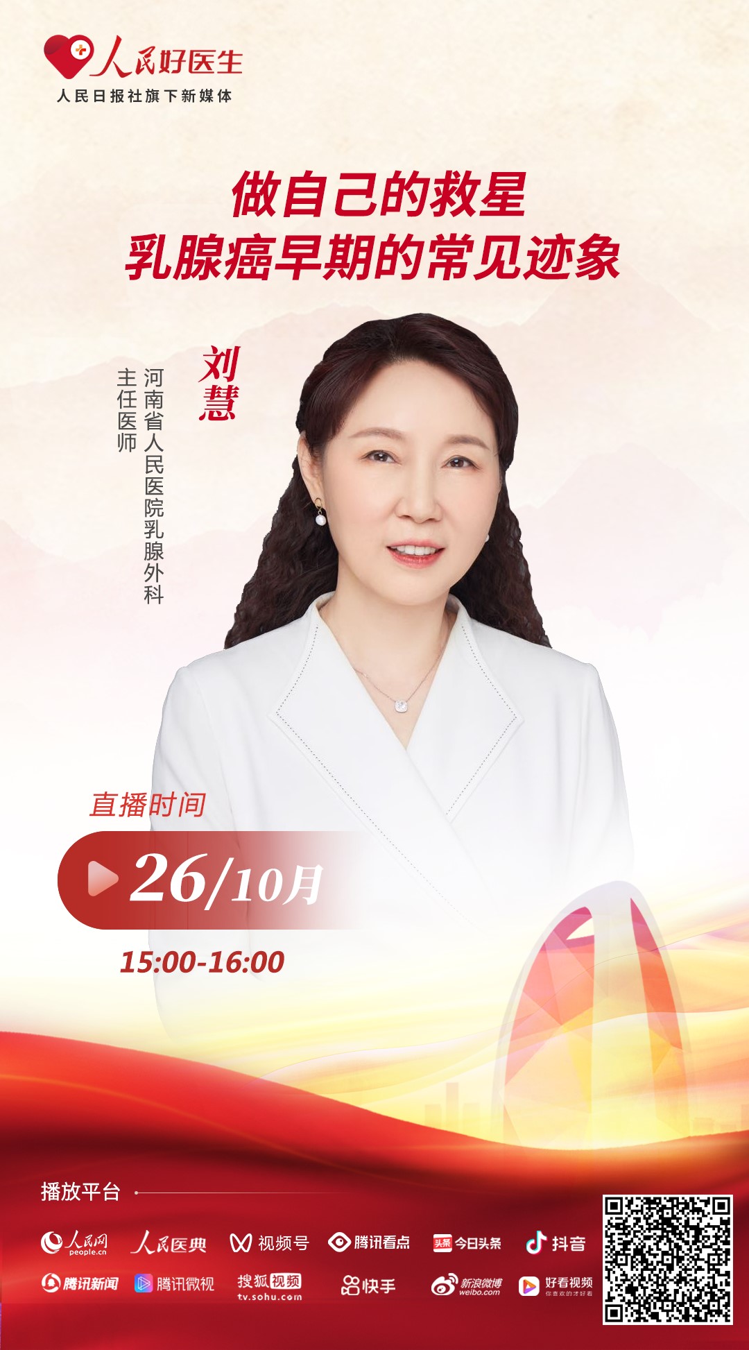 乳腺癌的預后與疾病的發展階段密切相關,疾病越早被發現,則患者5年內存活的機會就越大,因此早診早治尤為關鍵。10月26日(周二)15:00,“人民好醫生”客戶端將邀請河南省人民醫院乳腺外科主任醫師劉慧進行視頻直播,為您科普乳腺癌早診早治的相關知識,千萬不要錯過。