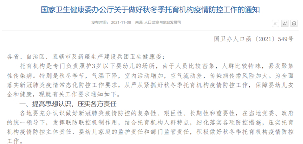 《通知》指出,各地要按照《托幼機構新冠肺炎疫情防控技術方案(第四版)》要求,指導托育機構加強人員管理,做好收托嬰幼兒的健康核查、體溫檢測和工作人員的健康管理、健康教育等工作;加強環境管理,重點做好嬰幼兒生活區域的通風換氣、清潔消毒及食品飲用水管理和垃圾分類;加強監測預警,做好流感等秋冬季常見傳染病防控工作,降低與新冠肺炎疊加流行的風險。
