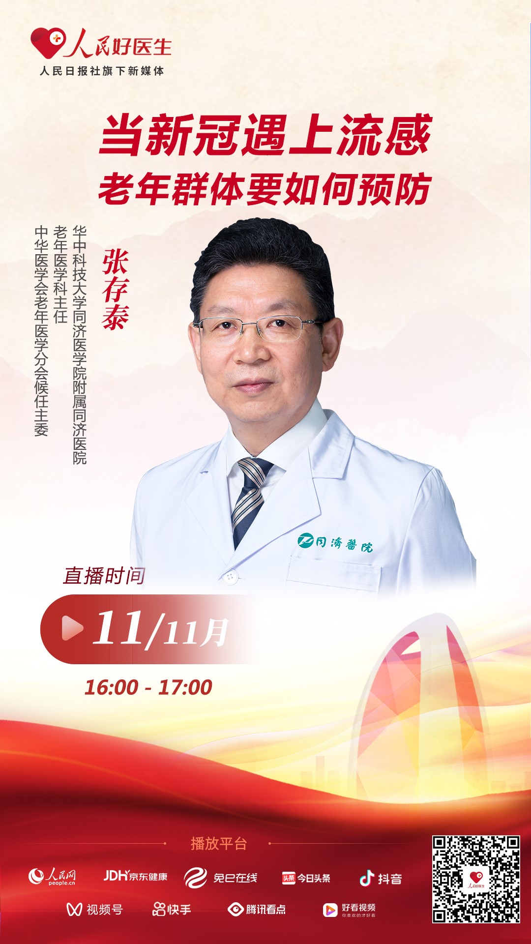 11月11日16:00,華中科技大學同濟醫學院附屬同濟醫院老年醫學科主任張存泰做客人民好醫生客戶端,為網友科普老年群體應如何預防流感等相關話題,歡迎屆時收看。