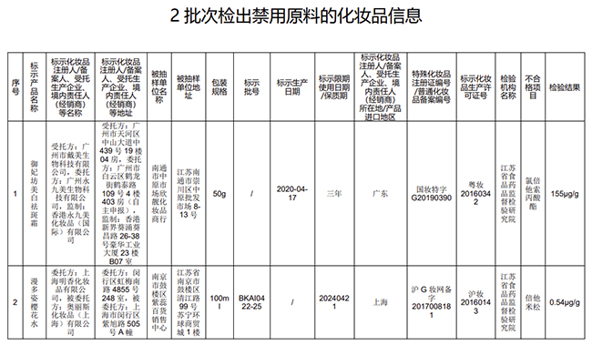 人民網(wǎng)北京11月12日電 (記者孫紅麗)據(jù)國家藥監(jiān)局官網(wǎng)消息,國家藥監(jiān)局近日發(fā)布通告,標示為委托方廣州永九美生物科技有限公司、受托方廣州市戴美生物科技有限公司生產(chǎn)的御妃坊美白祛斑霜,標示為委托方上海明香化妝品有限公司、受托方奧麗斯化妝品(上海)有限公司生產(chǎn)的漫多姿櫻花水,檢出《化妝品安全技術(shù)規(guī)范(2015年版)》中規(guī)定的禁用原料。
