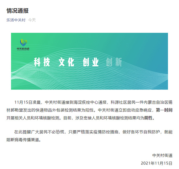人民網北京11月15日電 (記者孫紅麗)據中關村街道官方政務公眾號“樂活中關村”消息,11月15日凌晨,北京中關村街道接到海淀疾控中心通報,科源社區居民一件內蒙古自治區錫林郭勒盟發出的快遞物品外包裝檢測結果為陽性。中關村街道立即啟動應急響應,第一時間開展相關人員和環境核酸檢測。目前,涉及密接人員和環境核酸檢測結果均為陰性。在此提醒廣大居民不必恐慌,只要嚴格落實疫情防控措施,做好各環節自我防護,就能阻斷病毒傳播渠道。