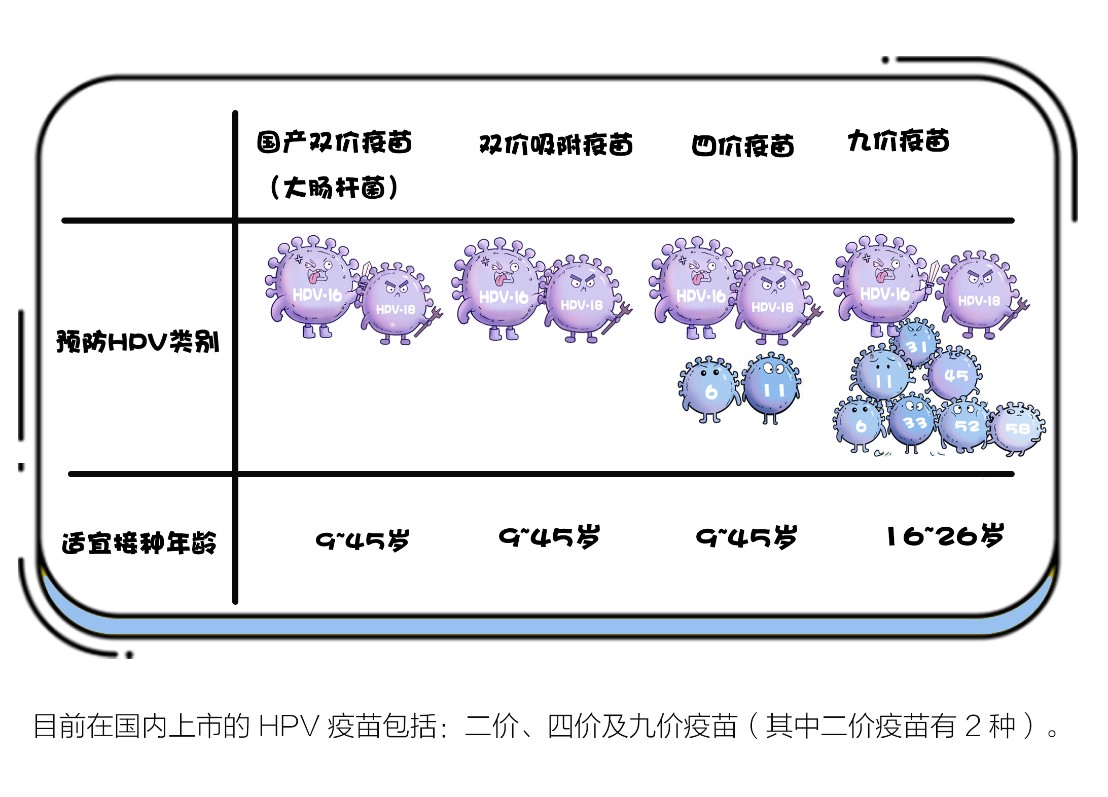 專家介紹,接種HPV疫苗可以預防約70%—90%的宮頸癌。目前,在國內上市的HPV疫苗包括二價、四價及九價疫苗。二價疫苗針對HPV-16和18兩種高危型別;四價疫苗在這兩者基礎上,增加了HPV-6和11兩個低危型別;九價疫苗則在四價疫苗基礎上多加了5種高危型別HPV,分別是HPV-31、33、45、52、58。四價和九價疫苗適用于9-45歲女性,但九價疫苗僅適用于16-26歲女性。