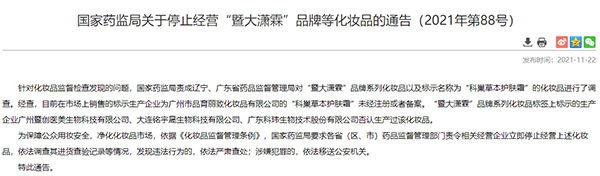 國家藥監局:停止經營“暨大瀟霖”品牌等化妝品