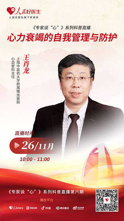 11月26日10:00,人民日報(bào)社旗下新媒體客戶端“人民好醫(yī)生”將邀請上海中醫(yī)藥大學(xué)附屬曙光醫(yī)院心血管科主任王肖龍做客直播間,帶大家了解心力衰竭的相關(guān)內(nèi)容,歡迎大家收看!